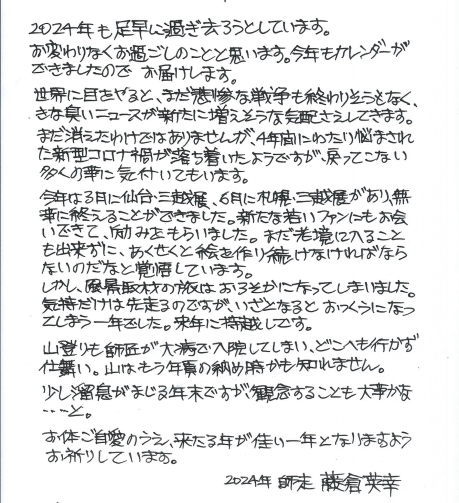 | ■ほろ酔い通信:2020年師走 2020年も押し詰まってきました。お変わりなくお過ごしことと思います。 何の前れもなくやって来た新型コロナウィルスに明け暮れた一年に、戸惑うばかり・・・。 何だか2〜3歳老けてしまったような気がします。 ただ作品づくりには集中できたのかなと思っています。絵をつくるのは一人きりの作業ですから…。 それでも、2年前からの山登りの師匠のお陰で6回も山に登れたのは、 新鮮な気晴らしになりましたし、大きな空白把握の動強になりました。 花の富良野岳、秋の雌阿寒岳と紅葉のオンネトー湖が強く印象に残りました。 さっそく絵にもしました。もちろんマスクはずしての行動です。 展覧会も少なく、寂しかったのですが、来年はその反動か9つが予定されています。 美時に開催されることを願っているのろす。 まだ、しばらくはコロナ禍の中での生活が続くと思いますが、我慢するのも美徳と思って過ごしましょう。 お体自愛のうえ、少しでも困るい一年となりますようお祈りしております。 2020年師走 藤倉英幸 来年は実り多い年にしたいと思います。 |